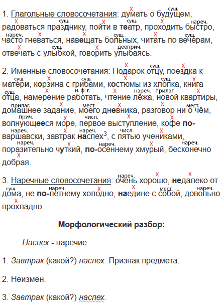 В зависимости от главного слова словосочетания делятся на глагольные, именные и наречные.